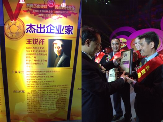 2013年1月18日晚,“肩負歷史使命,勇擔時代責任”為主題的番禺區工商業聯合會2013年迎春晚會在亞運綜合館盛大舉行,來自廣州銳豐音響科技股份有限公司、番禺電纜集團等多家企業員工歡聚一堂,同臺獻藝,喜迎新春佳節的到來。身為區工商聯主席的王銳祥董事長晚會開幕致辭,并榮獲“杰出企業家”稱號。