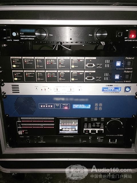 這次巡演中還將使用一件V-Mixing系統組件,Roland R-1000多軌播放/錄音機,它將為Midas Pro1調音臺提供虛擬彩排支持。Farina先從Midas臺子得到AES 50信號,送到KT 9650轉換器,再通過光纖口輸出到Roland S-MADI轉換器,最終轉換到R-1000所使用的Cat5e網線信號。R-1000內部有輸入/輸出跳線,這使得Farina可以通過R-1000的REAC A接口設置、命名、錄制和播放現場的多軌音頻信號。Farina說:“這相當容易。我把它們都連接起來, Roland錄音單元立刻識別到信號,隨后就鎖定好了。”R-1000記錄下整場演出,Farina在之后的聲場調整時播放錄制的音頻,作為調整的主要參考。直接錄制到R-1000,然后他們再將這些錄音返回到臺子上。Farina解釋說:“我只需要點一下按鍵,開始虛擬彩排,然后一切都進行得很完美。隨后我就開始專心調整房間的聲場了。” 這對于不同場地之間一場場的巡演來說非常節省時間。Farina本人也非常喜歡隨身帶著R-1000,因為總有些人一時興起想錄點什么東西。