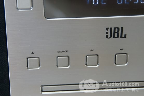 面板上集成了所有操作按鍵、LED屏、CD艙門以及音量旋鈕。按鍵和CD艙門同面板一樣是金屬拉絲工藝,不過紋理更為細密,而音量旋鈕則是圓形細紋表面。按鍵的按壓感十分清脆,音量旋鈕有較為明顯的段落感,旋動阻力較小但段落定位準確。雖說有遙控器之后面板控制變得可有可無,但面板按鍵的品質能夠從細節反應出產品的優劣,很顯然JBL的專業水準和敬業精神相當讓人滿意。