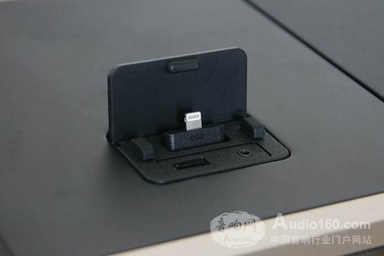 主機頂部有翻蓋式隱藏接口模塊,提供了蘋果閃電接口、USB接口以及3.5mm音頻輸出口(供耳機使用)。其中蘋果閃電接口有內置彈簧以確保連接設備不會輕易倒下,三塊橡膠墊能夠避免連接的蘋果設備外殼和機身碰撞刮傷。該閃電接口支持最新的iOS設備,包括iPhone5/5S、iPad以及iPoD等。