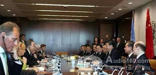 圓滿結束演講后,國家主席習近平在聯合國總部會見了聯合國秘書長潘基文。會談在聯合國總部大樓38層的聯合國秘書長會議室舉行,會談全程使用了TAIDEN HCS-5300系列數字紅外無線系統。