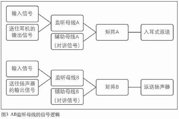 目前,部分表演者習慣于同時使用入耳式返送耳機和地板式返送揚聲器來進行監聽,通過耳機來獲取音色細節、平衡與空間感,通過地板式返送揚聲器來獲得信號的動態和沖擊力(尤其對于打擊樂聲部而言更是如此)。還有一種情況,是同一場演出的不同演奏者對于返送信號的聽音習慣各不相同,有些人習慣于只聽耳機,有些人習慣于只聽揚聲器,有些人則習慣于同時聽兩者。當出現上述情況時,AB監聽母線功能的便利之處就凸顯出來。在這種情況下,返送調音師就會同時利用耳機和返送揚聲器來進行監聽:可以將A母線送往耳機,B母線送往返送揚聲器,調音師可以根據演員的實際需求,既能夠分別單獨監聽耳機或返送揚聲器的信號,也能夠同時對兩者進行監聽。
