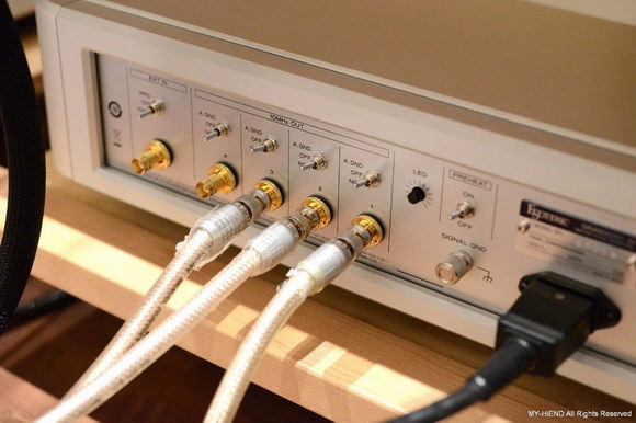 Grandioso P1X本體與獨立電源的連接,Esoteric很早就開始使用自家的數位傳輸界面“ES-LINK 5”,左右聲道各使用一條HDMI線與Grandioso D1X連接,這個界面可輕松的傳輸到DSD 22.5MHz與PCM 768kHz/48Bit,正中間那條則是時鐘線接到Grandioso G1主時鐘