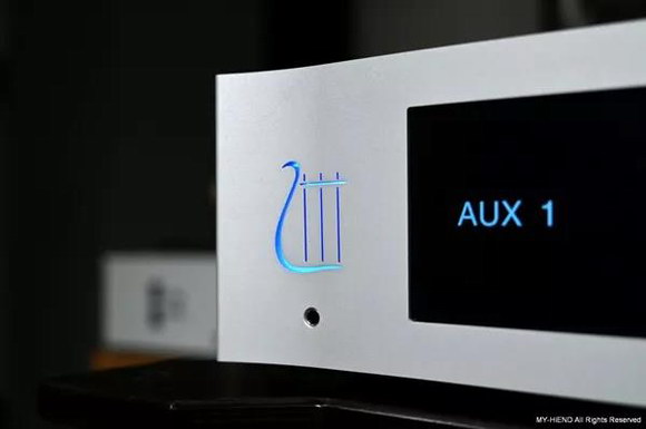 這次試聽的是Absolute合并擴大機,新一代的Orpheus前方都配有一個彩色顯示屏幕,在右方的音量旋鈕兼有電源開關的功能,左方天琴的Logo在待機模式下是紅色,開啟使用時會變為藍色,Logo下方有一個耳機輸出。