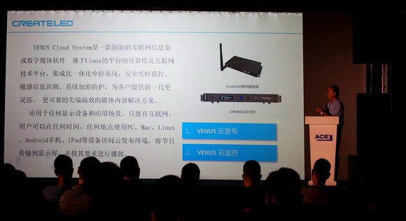 應用于任何顯示設備和應用場景,只要有互聯網,用戶可以在任何時間、任何地點使用PC、Mac、Linux、Android手機、iPad等設備訪問云發布終端,將節目傳輸到顯示屏,并按其要求進行播放。顯示產品的加入,是ACE邁向系統集成化戰略的重要一步!