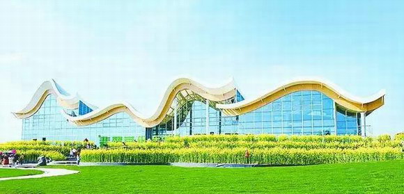 主體建筑透明的玻璃,映照著藍天、白云、黃花、綠草等自然景象;玻璃之上,藍天為底,畫上了黃白相間的波浪線條,像極了隨風起舞的稻浪。
