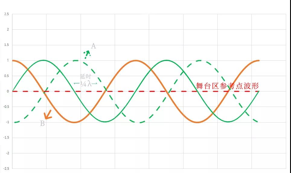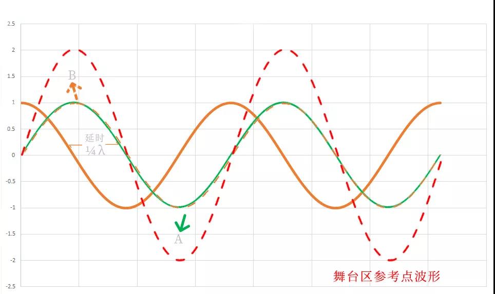 我們就得到了一個(gè)想要的結(jié)果,即舞臺(tái)區(qū)抵消,觀眾區(qū)疊加。那這次我們是否可以對(duì)其他頻段起到同樣的作用呢?我們從圖上可以看出,對(duì)于舞臺(tái)區(qū)域來(lái)說(shuō),經(jīng)過(guò)延時(shí)的B音箱,在空間當(dāng)中的虛擬位置已經(jīng)和A音箱完全重疊,且完全反相,所以任何的頻率的聲音從理論上來(lái)說(shuō),都應(yīng)該是完全抵消的。這樣一來(lái)我們就解決了舞臺(tái)區(qū)串音及回授的問(wèn)題。
