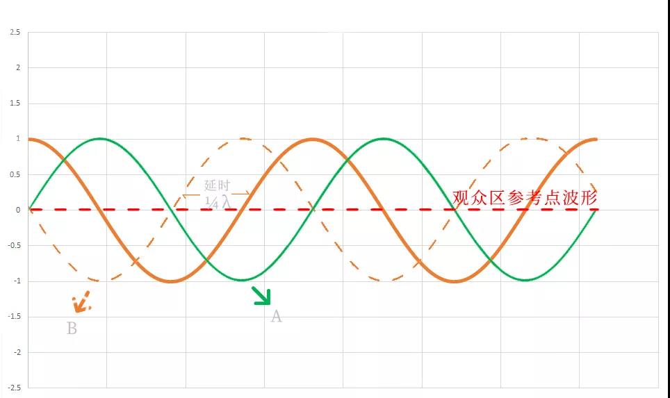 答案就在時(shí)域上,我們來(lái)看一下,當(dāng)對(duì)A或B音箱做延時(shí)的時(shí)候,分別會(huì)出現(xiàn)什么情況。
