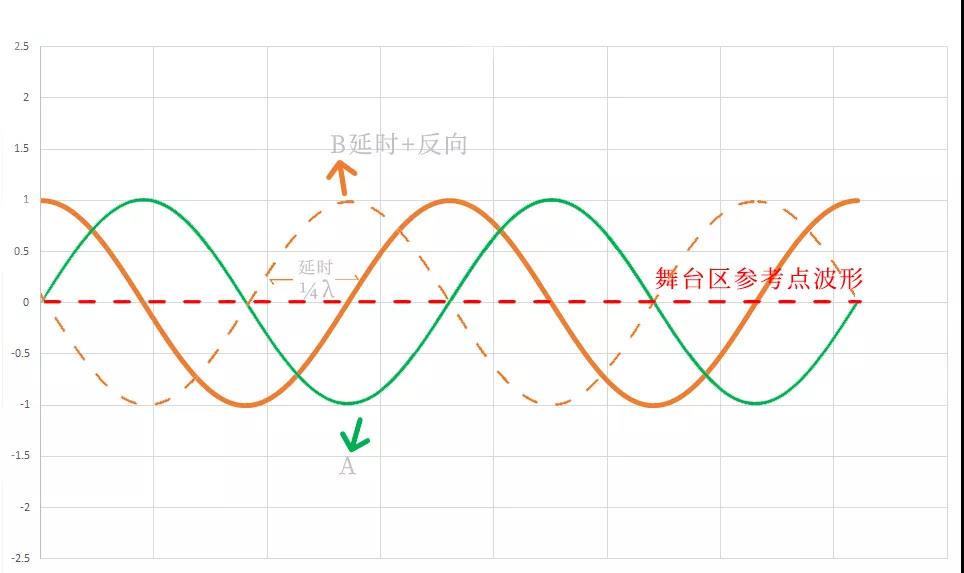 那我們?cè)賮?lái)看一下對(duì)B做延時(shí)的情況,對(duì)B做延時(shí)之后,我們得到了一個(gè)舞臺(tái)區(qū)域疊加,觀眾區(qū)域衰減的效果,如果我們?cè)賹?duì)B做一次反相。