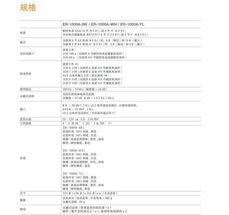 有了ER-1000A,即使在嘈雜或擁擠的地方,你的聲音也會清晰地傳達給聽眾。內置數字功率放大器和經過優化的語音頻率特性,實現高清晰的擴聲效果。