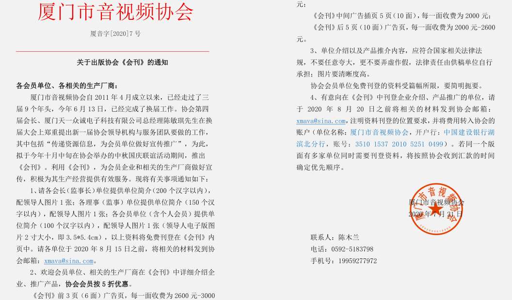 4、有意向在《會刊》中刊登企業介紹、產品推廣的單位,請于2020年8月20日之前將相關的材料發到協會郵箱:xmava@sina.com,注明資料刊登的位置要求,并將費用轉入協會的賬戶(單位名稱:廈門市音視頻協會,開戶行:中國建設銀行湖濱北分行,賬號:3510 1537 2010 5251 0499)。若同一個版面有多家單位同時需要刊登資料,將按照協會收到匯款的時間確定優先順序。