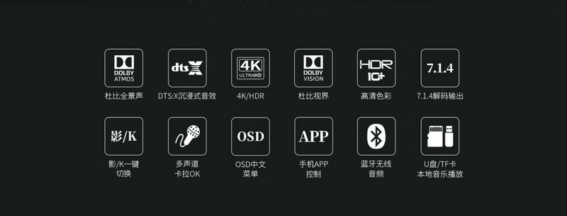 25款功能亮點(diǎn),滿(mǎn)足更勝于從業(yè)者和消費(fèi)者的需求: 1.支持Dolby Atmos、DolbyTrue-HD及向下兼容所有杜比音頻編碼文件; 2.支持DTS:X、DTS-Master及向下兼容所有DTS音頻編碼文件; 3.支持HDMI2.0,支持HDCP2.2; 4.支持4K/60Hz,RGB 4:4:4,18GHz全帶寬高清視頻信號(hào); 5.支持Dolby Vision及HDR 10+高清視頻信號(hào); 6.多達(dá) 13聲道的全景聲7.1.4音頻解碼線路輸出;