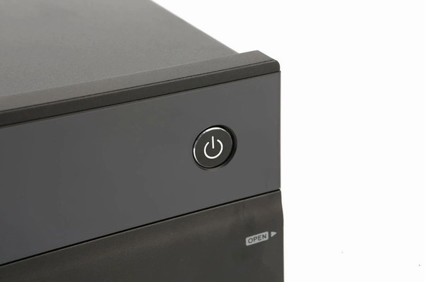 除了左右上角的億格瑞Logo和圓形電源開關(guān)之外,整個前面板看不到其他接口,視覺上的整體感很好。其實它的下半部分是下翻蓋設(shè)計,打開后可以看到里面的設(shè)置—包括兩個SATA 3.0接口的3.5英寸硬盤倉、兩個USB 2.0接口以及RST鍵,其中可支持單塊最高18TB容量的硬盤。